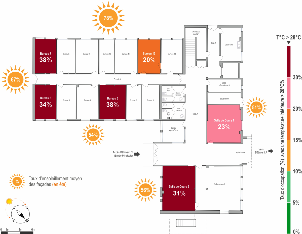 Ces analyses ont permis de confirmer les températures élevées présentes dans les bâtiments durant l’été, avec une moyenne de 28°C. De fortes amplitudes de températures ont été relevées dans certains bâtiments, et les températures les plus élevées (au-dessus de 28°C) apparaissent dans les bâtiments exposés au sud.