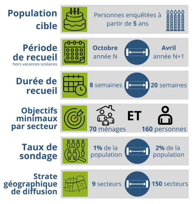 La méthodologie EMC², tout comme celle des EMD auparavant, permet d’obtenir une photographie des déplacements des résidents de l’aire d’étude sur un jour moyen de semaine. La passation des enquêtes se fait du mardi au samedi (hors jours fériés et période de vacances scolaires) sur les déplacements de la veille, soit du lundi au vendredi.