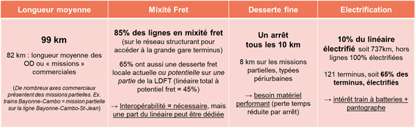 Un premier travail d’analyse technique des aspects ferroviaires de l’ensemble des ligne de desserte fine du territoire (LDFT) a été mené et a permis de définir les principales problématiques techniques des petites lignes, à travers l’analyse de 220 orgine-destination soit 147 axes commerciaux.