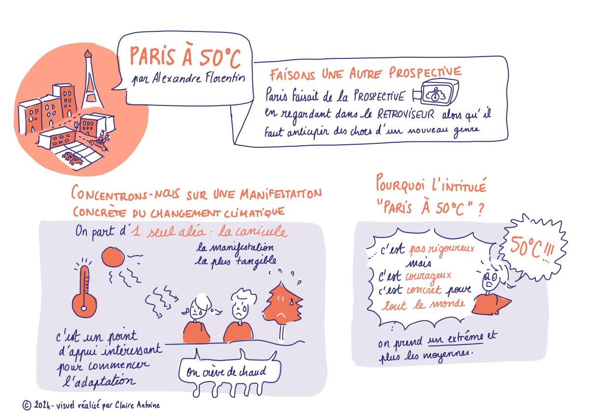 Alexandre Florentin, élu à la ville de Paris, a présenté l’action de la mission "Paris à 50°C" qu’il a présidée. Le travail de cette instance transpartisane a consisté à auditionner plus de 75 personnes, réaliser 3 visites de terrain durant 6 mois avant de délibérer sur les préconisations du rapport (téléchargeable ici). Cette démarche a nourri des plans stratégiques déterminants pour la ville de Paris : ses Plans Climat, Résilience, Santé ainsi que son Plan Local d’Urbanisme bioclimatique. Par ailleurs, elle a inspiré une série d’événements ou de productions artistiques autour de l’adaptation (BD, spectacle, film…).