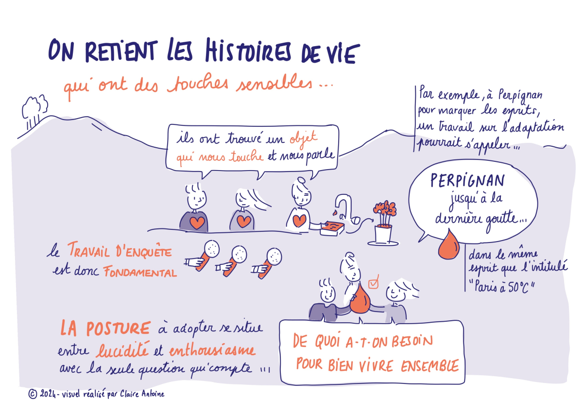 Un des partis pris de la Mission a été d’adopter une communication sensible et concrète autour du changement climatique, en partant d’un angle d’attaque extrême, les canicules à 50°, qui parle à toutes et tous. Ce témoignage a convaincu les participants et participantes de l’intérêt d’une approche incarnée, qui montre les impacts du changement climatique dans la vie quotidienne sur le territoire, pour mobiliser autour de l’adaptation.