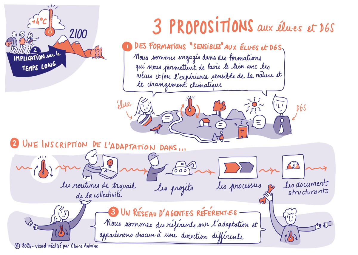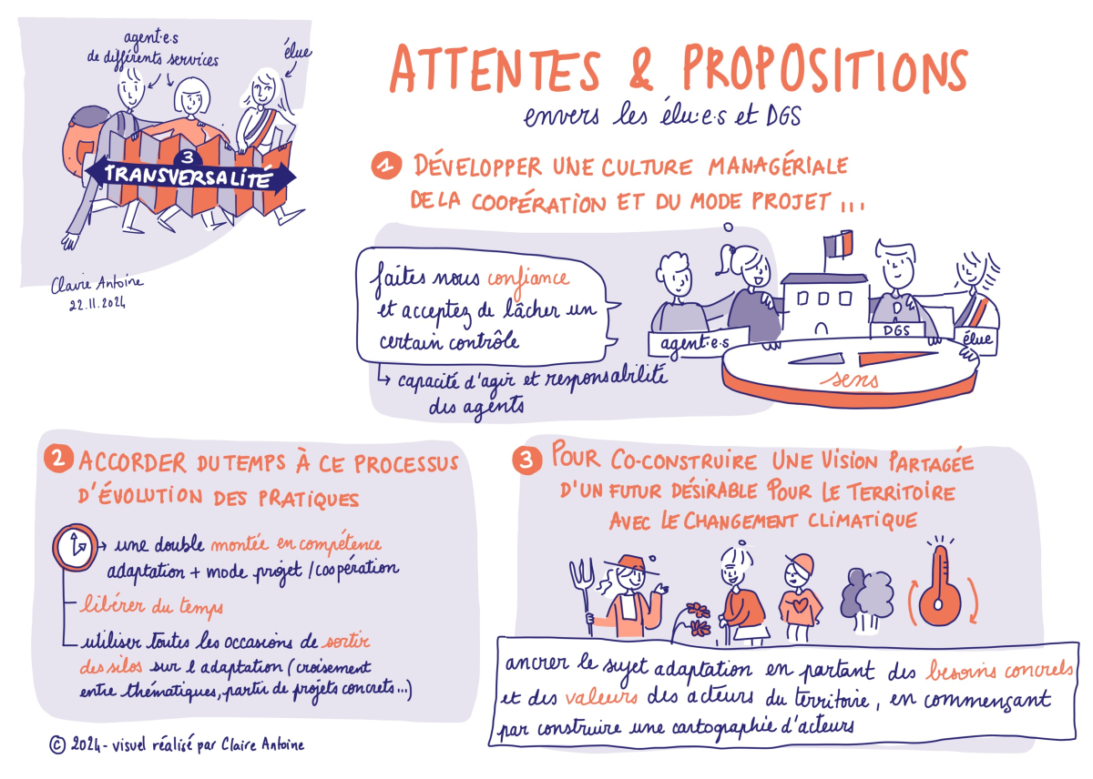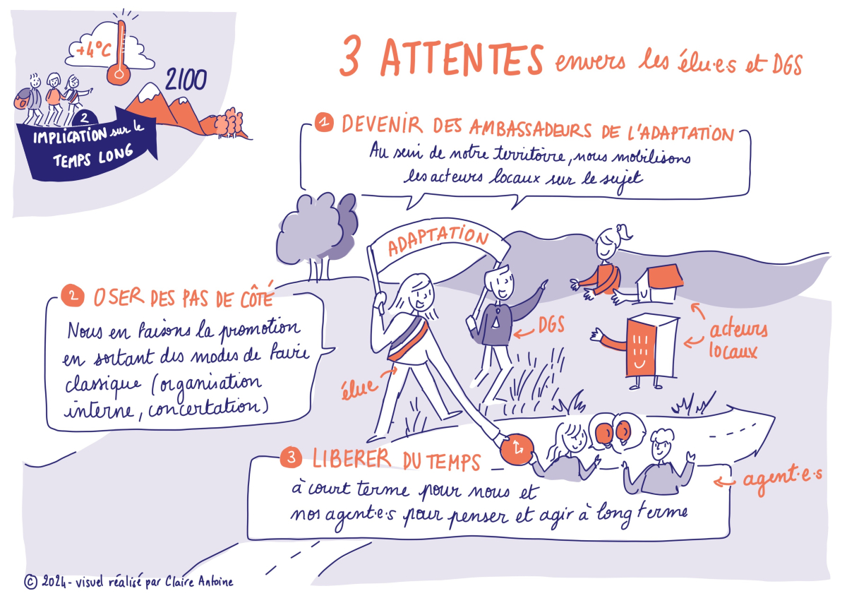 “Nous devons revoir nos éléments de langage. […] Il est important de trouver les bons termes pour les élus, nous devons passer d’un sujet pour les spécialistes à un sujet concret pour tout le monde, c’est-à-dire rendre accessible les enjeux d’adaptation en démystifiant le côté scientifique.", explique ce participant. Une autre : "Tous les élus ne sont pas sensibles à la dimension écologique. En revanche, ils accrocheront si on leur parle de protéger leur population. Pour nous agents, s’inspirer de ces pratiques est un changement de culture et de méthode."