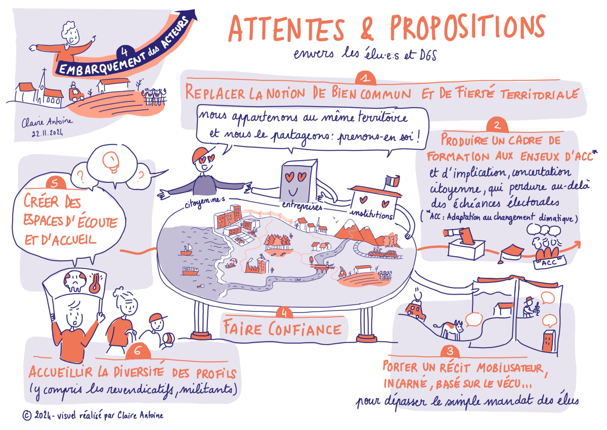 Embarquer les acteurs, à chacune des étapes de la démarche d’adaptation : parler du changement climatique avec lucidité dans le territoire, écouter et embarquer toutes les forces vives du territoire pour co-construire une vision partagée puis un plan d’action, dans lequel chacun aura un rôle à jouer… Il s’agit de parvenir à embarquer à tous les niveaux : en interne, les élus et les services, sur le territoire (tous les EPCI, toutes les communes), et plus largement, les citoyens et citoyennes, acteurs socio-économiques, l’État.