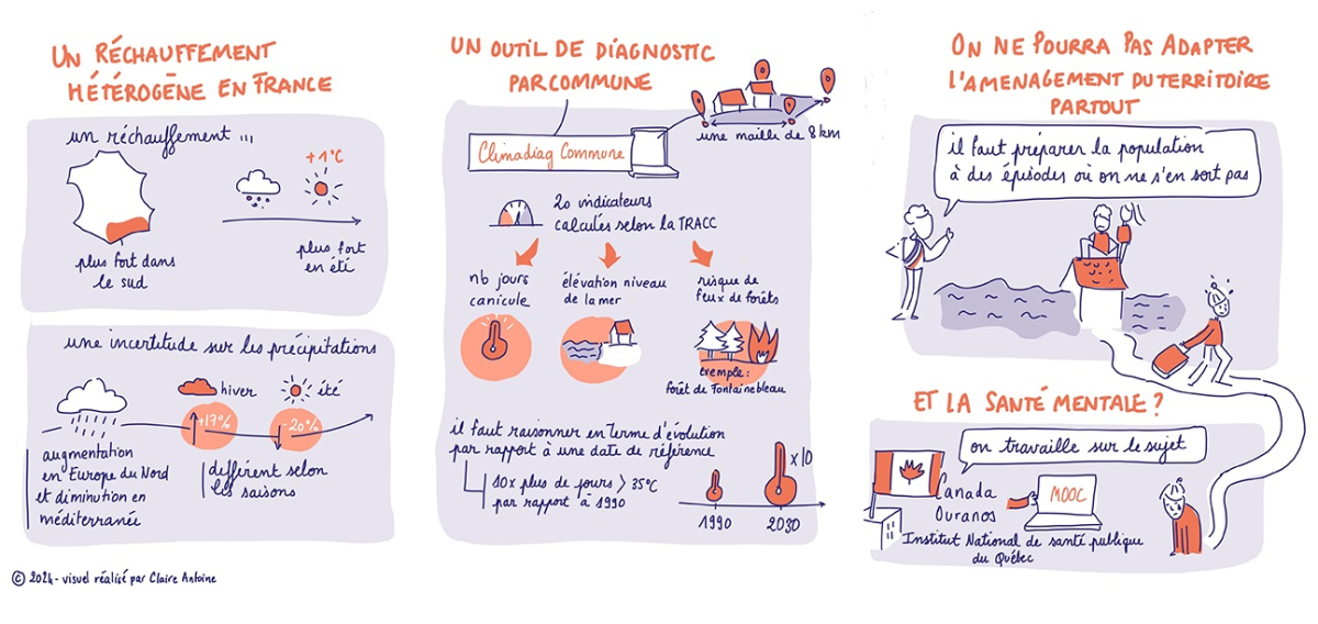 La directrice des services climatiques de Météo-France, Sophie Martinoni-Lapierre, a présenté la Trajectoire de référence de l’adaptation au changement climatique (TRACC) "La France à +4°C" ainsi que les services climatiques de l’opérateur. La directrice a mis en lumière l’hétérogénéité du réchauffement dans les différents territoires français. Elle a aussi insisté sur la nécessité de travailler les indicateurs climatiques non seulement en moyennes annuelles, mais aussi en moyennes saisonnières ou mensuelles, ainsi qu’en valeurs extrêmes. En effet, certaines conditions saisonnières ou certains extrêmes constituent des facteurs limitants (températures trop élevées pour le corps humain par exemple) particulièrement impactants et que la moyenne ne reflète pas.