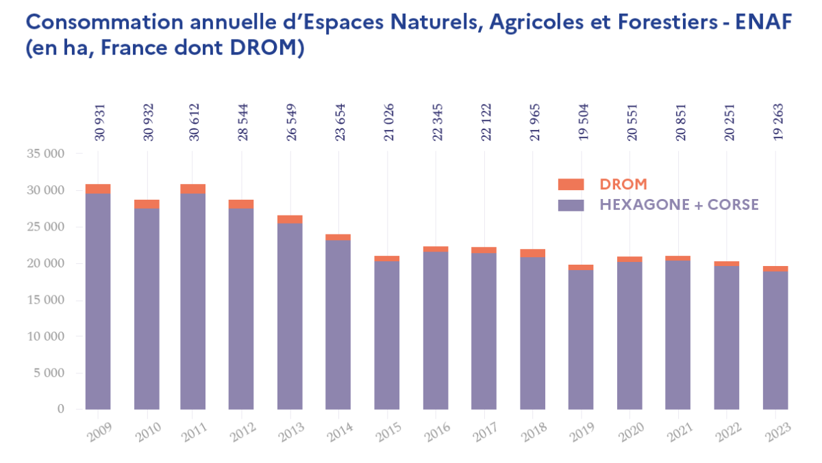19 263 hectares ont été artificialisés en 2023, chiffre le plus bas depuis le lancement de cette étude en 2009, inscrivant dans la durée la baisse de la consommation foncière depuis 2021. 63% de cette artificialisation est destinée à l'habitat, 23% à l'activité.