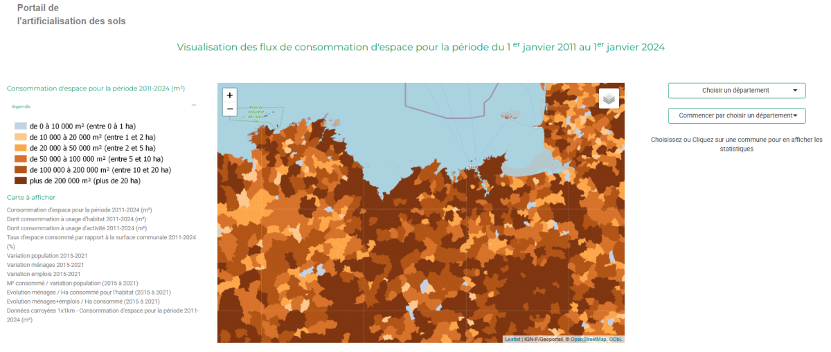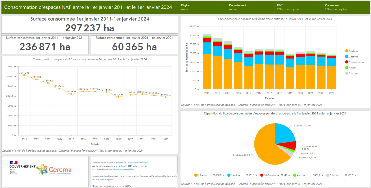 Des outils d'aide à la visualisation et à l'analyse de ces données sont aussi proposés, via un tableau de bord interactif et la publication d'indicateurs pré-calculés qui permettent d'observer l'évolution de l'artificialisation entre le 1er janvier 2009 et le 1er janvier 2024 à plusieurs échelles territoriales.