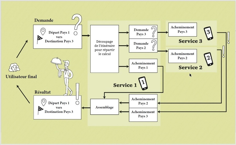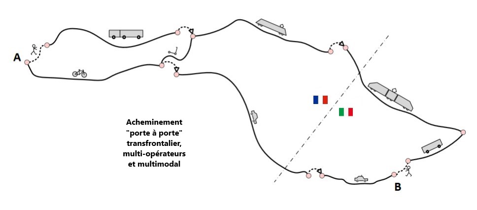 The principle is that of door-to-door multimodal navigators. This Linking Alps principle is linked to the observation that a single multimodal navigator for the whole of Europe does not work as European Commissioner Slim Callas had imagined in 2012. The Linking Alps project, like the Linking Danube project, is based on the principle of route calculation divided between the various tools developed locally.