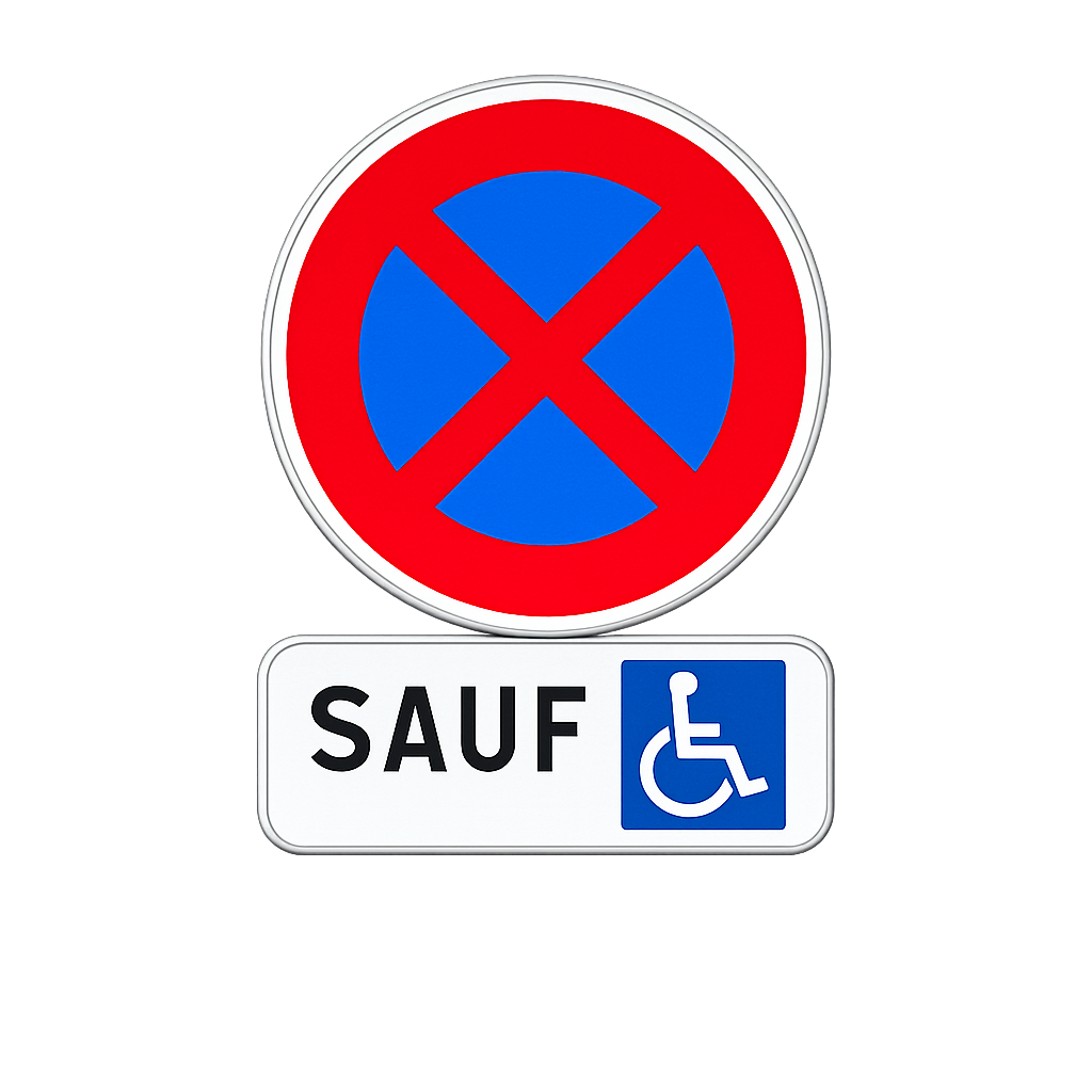 même manière, une signalisation exclusivement verticale est possible. Elle repose sur l’implantation d’un panneau d’interdiction d’arrêt et de stationnement (B6d), complété par un panonceau M6h précisant que la restriction ne s’applique pas aux personnes titulaires de la carte de stationnement.