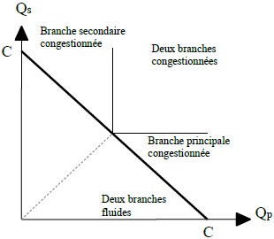 - l’aire foncée correspond à l’état congestionné du divergent. La demande vers une (ou chaque) branche avale est supérieure à la capacité de cette branche. Dans ce cas, le nœud divergent sature et impacte l’ensemble des véhicules se présentant sur le divergent.