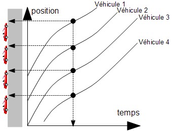 La vitesse instantanée de chaque véhicule correspondre la pente des trajectoires (pente élevée = vitesse élevée).