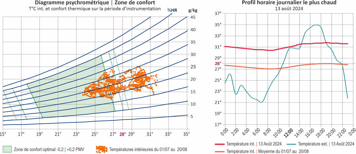 L'analyse des mesures par locaux est présentée à l'aide d'un diagramme psychrométrique qui permet de visualiser graphiquement les principales caractéristiques physiques de l'air, et d'un graphique linéaire à trois courbes qui permet de visualiser l'évolution temporelle des températures intérieures et extérieures sur une période donnée.