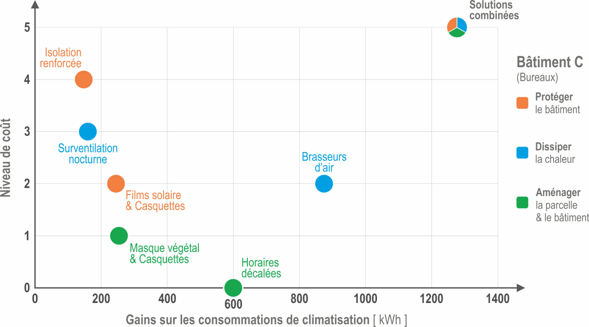 Plusieurs solutions techniques ont été comparées, à l’aide de critères d’efficacité (basées sur le taux global d’inconfort et les besoins de refroidissement) et de coût (coût global et coût d’investissement) qui permettent ensuite de les hiérarchiser. Les scénarios étudiés pour améliorer le confort d’été sont :