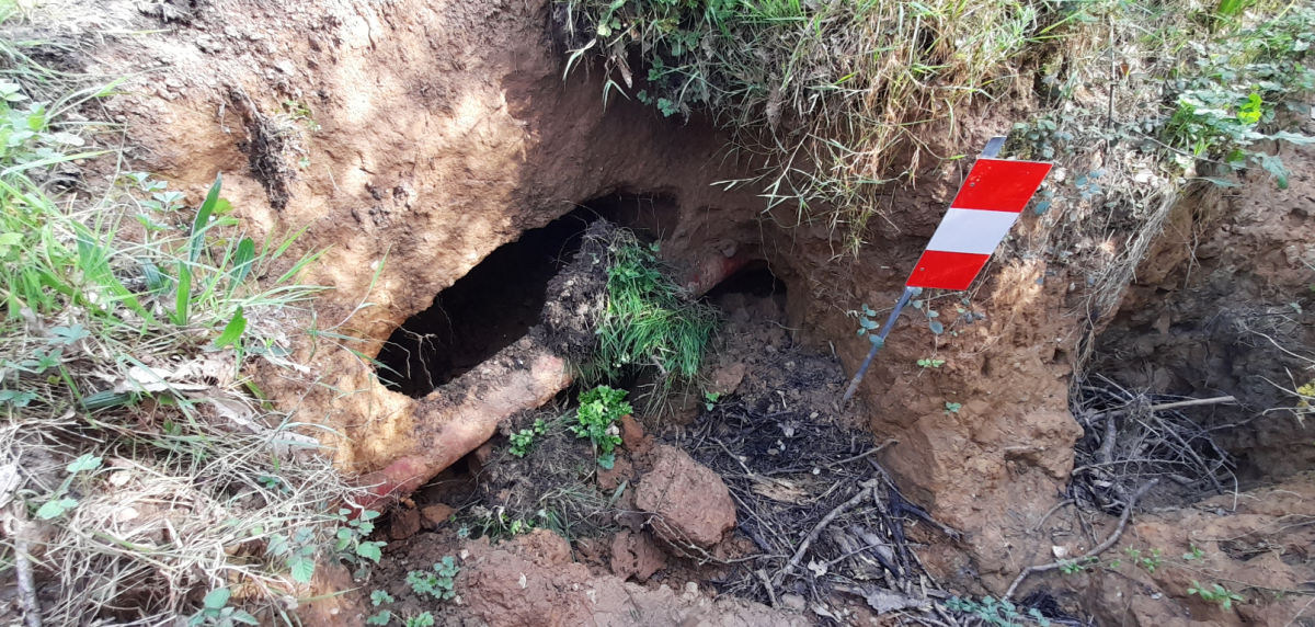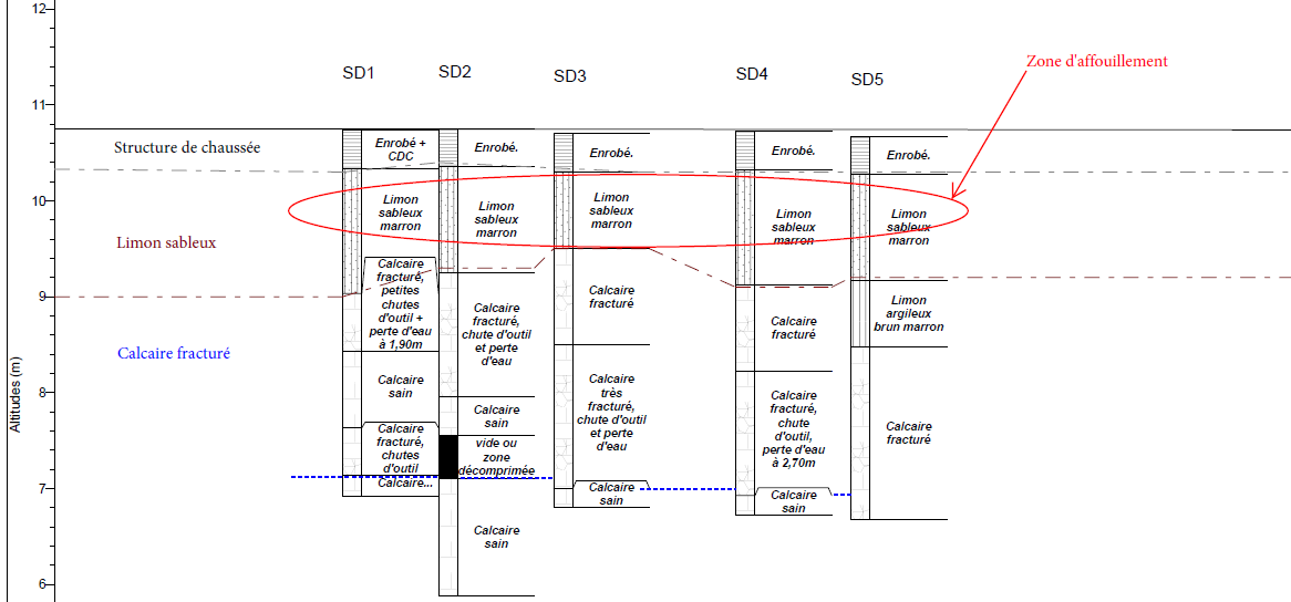 Ces investigations ont montré un environnement géologique particulier : la zone touchée repose sur un substrat calcaire, déjà connu pour ses affouillements et phénomènes karstiques (effondrement lié à la dissolution de la roche). De plus, des forages de captage d’eau potable sont situés à proximité, ce qui nécessite une attention particulière lors de l’intervention. Le départ des matériaux a mis à jour un réseau d’assainissement sous pression (eaux usées) en bordure de chaussée ; une fuite ou rupture de cette canalisation aurait eu pour conséquence d’augmenter le volume d’affouillement avec un risque de pollution.