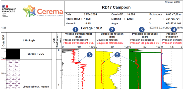 La campagne d’investigation de 13 forages réalisée par diagraphie instantanée, ou enregistrement des paramètres de forage, est une méthode géotechnique qui consiste à mesurer et à enregistrer les caractéristiques physiques du terrain traversé au cours d’un forage, de manière à établir la relation entre la résistance tu terrain, opposée à la détérioration créée par l’outil de forage.