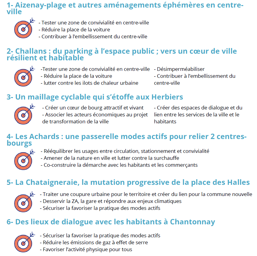 A la suite de l’invitation du Préfet de Vendée en septembre 2024, 6 communes participant au programme Petites Villes de Demain (PVD) se sont portées volontaires pour cet accompagnement collectif : Aizenay (10 500 hab), Challans (24 000 hab), Chantonnay (9 000 hab), La Chataigneraie (2 600 hab), Les Achards (5 500 hab), Les Herbiers (18 000 hab). Ces 6 communes au profil et contexte très variés, ont pu bénéficier d’un accompagnement du Cerema pendant plus d’une année, associant les chefs de projet PVD, les chargés de mission mobilité et leurs élus référents en commune et intercommunalité. L’accompagnement s’est clôturé le 4 décembre 2025 à Challans par un séminaire ouvert à toutes les communes PVD du département pour partager les principaux enseignements.