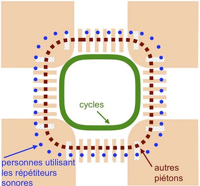 Il est notamment question de la lisibilité de la traversée, des îlots, des bandes d'interception, du guidage numérique, des balises sonores et des répétiteurs de feux.