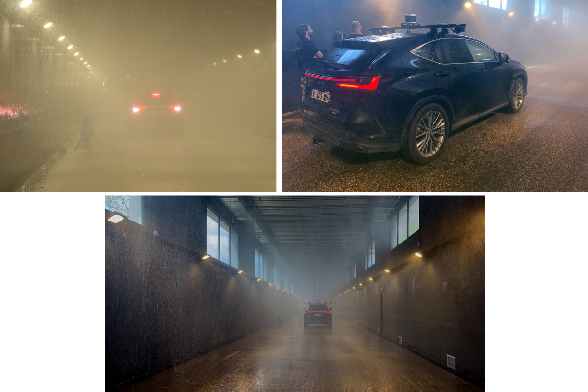 En complément de ces conditions météorologiques, des environnements lumineux complexes ont été recréés grâce à des accessoires et dispositifs scéniques mis en œuvre par le Cerema et l'UTAC, coordinateur du projet Weathersafe. Cela a permis de simuler, par exemple, un soleil rasant ou l’éblouissement causé par des phares de nuit, afin d’évaluer le comportement des capteurs dans des situations visuelles critiques mais fréquentes en conduite réelle.