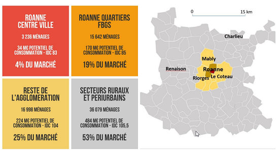 L’activité commerciale se maintient surtout dans deux grands pôles commerciaux : le centre-ville de Roanne et le centre commercial Mably, et elle augmente dans des villes périphériques comme Riorges, Perreux, Saint Nizier, Renaison.