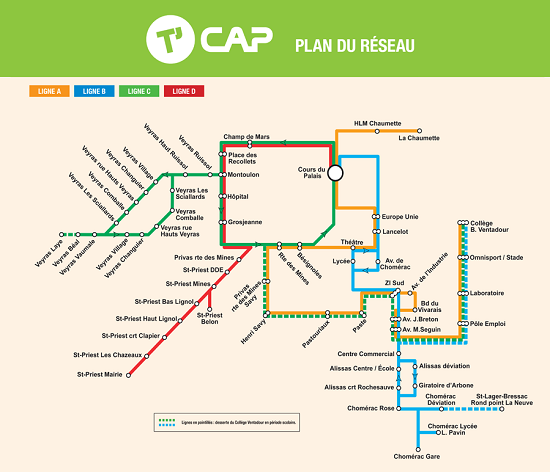 42 communes sont desservies avec des transports scolaires ouverts à tous, des lignes régulières, des transports à la demande et un réseau urbain sur Privas, Alissas, Chomérac, Veyras et Saint Priest, avec une tarification très avantageuse.
