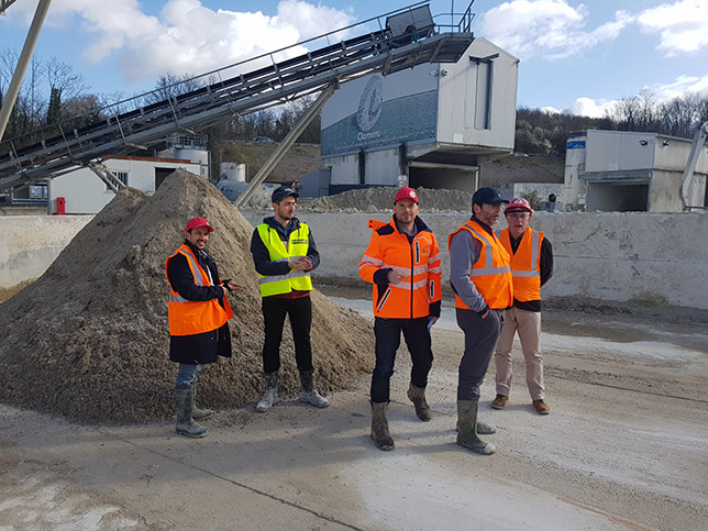 Visite de la plateforme de recyclage Clamens, à l’occasion d’une réunion de suivi du projet SAND. De gauche à droite : A. Ben Fraj (Cerema), J. Gouy-Pailler (Parex / Sika), A. Cudeville (Clamens), J. Soudier (Parex / Sika) et P. Léonardon (Ademe) © Cerema