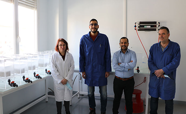 Amor Ben Fraj et quelques membres de son équipe dans la salle de lixiviation. De gauche à droite : Véronique Queyrat, Hamza Beddaa, Amor Ben Fraj et Jérôme Carriat © Cerema