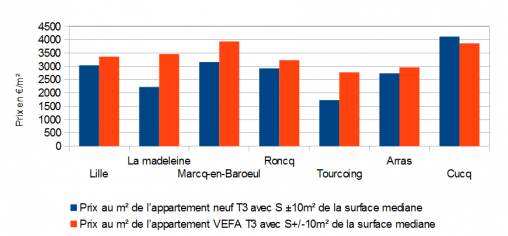 Comparaison communale des prix au m² entre le neuf et la VEFA pour un appartement T3, avec des surfaces avoisinantes, sur 2009-2014 dans le Nord-Pas-de-Calais (source : DV3FBéta : DVF 2005-2014, FF 2009-2015 – Cerema)