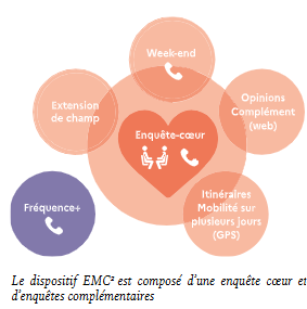 Pour la connaissance des déplacements quotidiens des résidents d’un territoire, les enquêtes EMC² - Enquête de Mobilité Certifiée Cerema restent des sources de données fondamentales : elles sont multimodales par construction, permettent de suivre l’enchaînement des déplacements, de recueillir des données descriptives des individus enquêtés et des motifs des déplacements, et alimentent les modèles de déplacements qui captent bien les paramètres de comportement. Également, elles présentent l’avantage que l’échantillonnage est maîtrisé, alors que les fournisseurs de sources de données massives ont leurs propres sources, dont on ne peut pas forcément apprécier le niveau de représentativité.