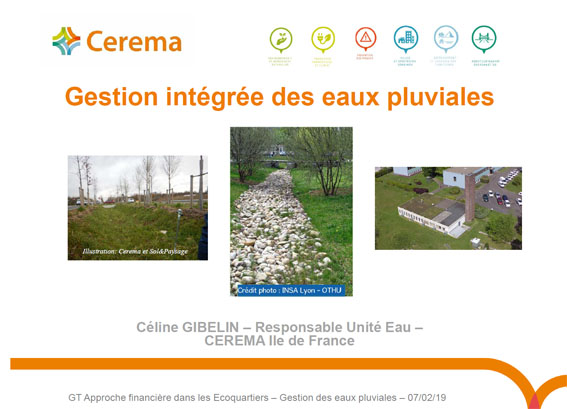 Le 7 février 2019, le Cerema a organisé, en collaboration avec le ministère en charge des EcoQuartiers, un groupe de travail national portant sur le coût global en aménagement sur le thème "la gestion intégrée des eaux pluviales".