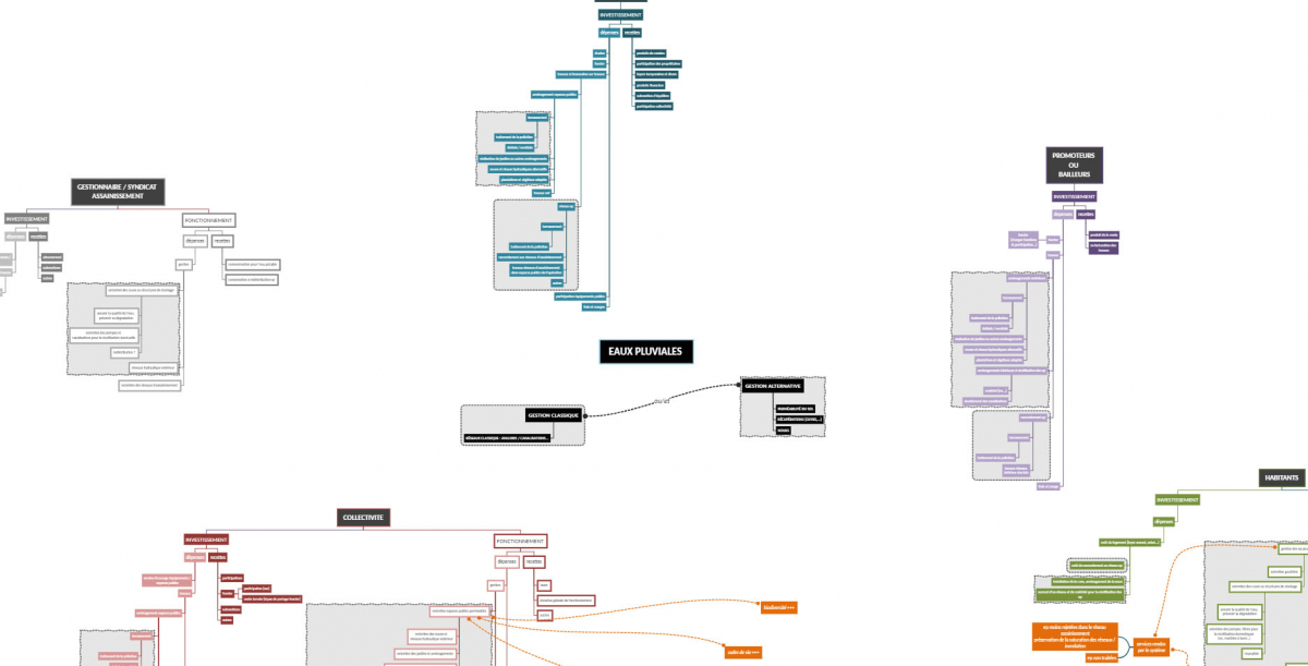 Cette carte mentale présente l’ensemble des acteurs de l’aménagement (aménageurs, promoteurs, collectivité, syndicat mixte…) avec une décomposition de leur budget en investissement et en fonctionnement (pour la collectivité et les habitants). Ce document développe ainsi « qui paye quoi ? », fait apparaître les différents objectifs des acteurs de l’aménagement : la plupart des acteurs interviennent uniquement dans la phase « investissement » de l’aménagement, laissant la collectivité et les habitants face aux problématiques liés au fonctionnement, l’exploitation ou l’entretien de l’espace, du quartier ou de la ville.