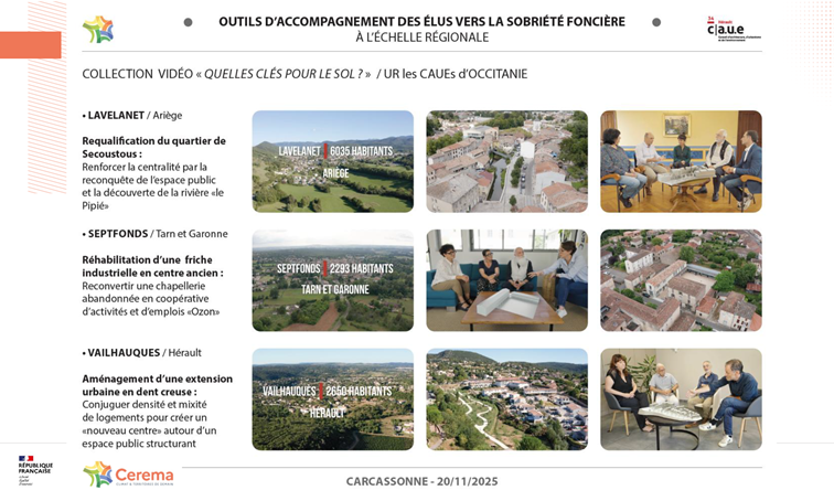 Les CAUE d'Occitanie ont créé une collection de vidéos "Quelles clés pour le sol ?", permettant de mettre en lumière des projets inspirants déjà réalisés par des communes. Quatre vidéos sont actuellement disponibles, dont celle de Vailhauquès, qui a été projetée en séance.