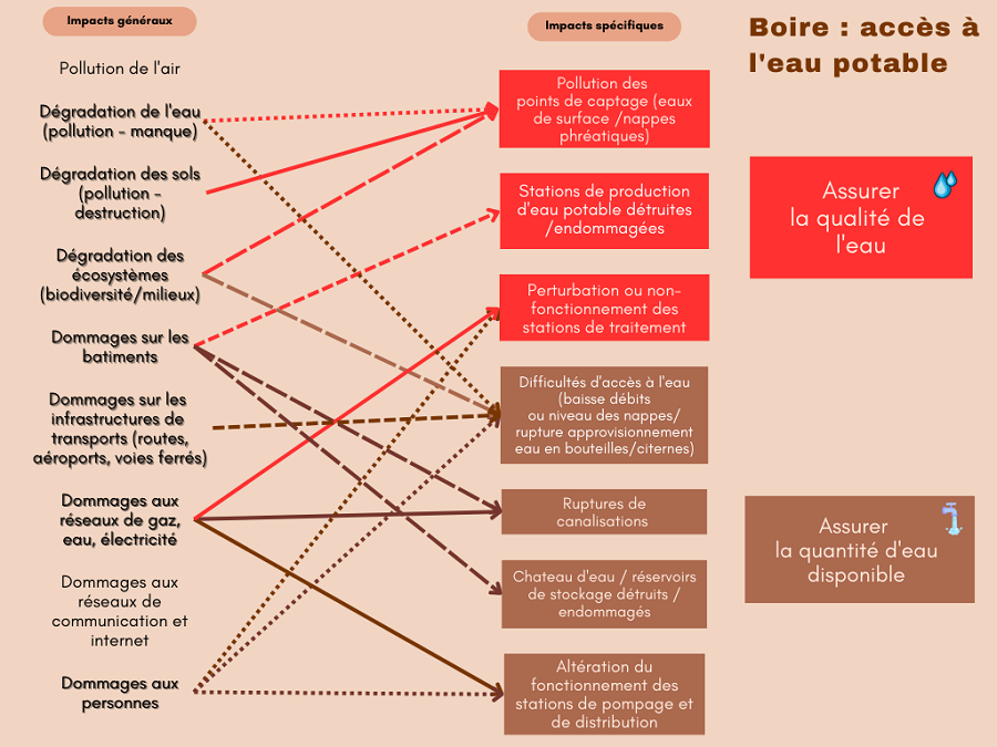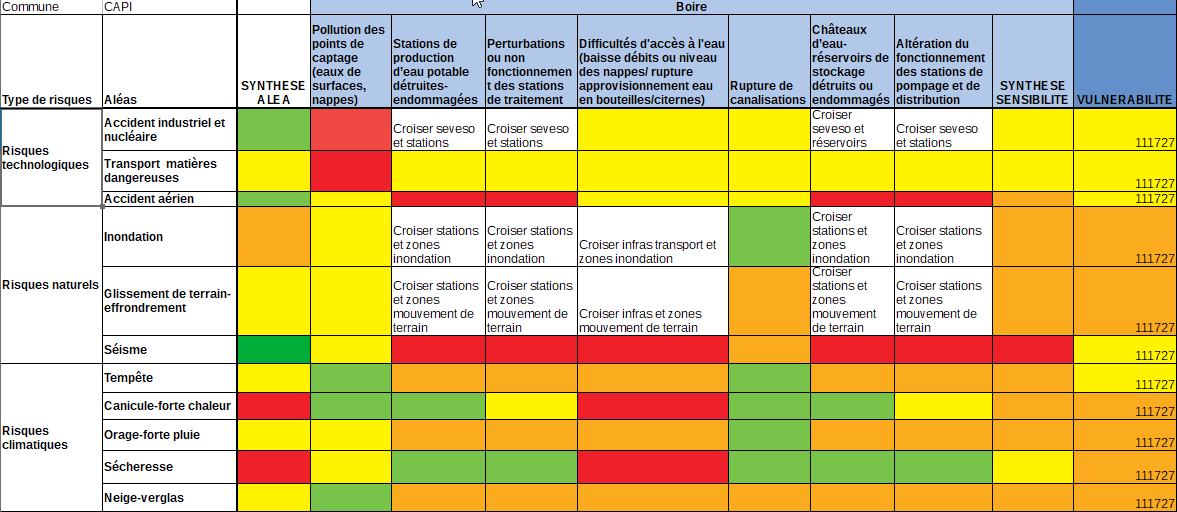 Pour cela la CAPI et le Cerema ont d’abord choisi les fonctions à traiter : boire, se nourrir, habiter, se déplacer, se soigner, produire, se divertir, se former. Puis ces fonctions ont été croisées avec les impacts généraux des aléas traités pour identifier les impacts spécifiques mettant en péril chacune des fonctions vitales.