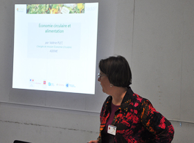 Valérie Plet, Chargée de mission économie circulaire à l’Ademe IdF a ensuite expliqué la façon dont ils traitaient la question de l’alimentation durable à travers l’accompagnement des porteurs de projets, la modification des habitudes et pratiques alimentaires et la réduction des pertes et gaspillages alimentaires.