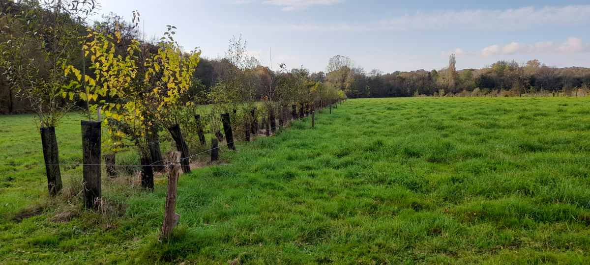 Les parcelles sont clôturées, sans barbelé dans un souci de bien-être animal, empêchent les vaches de venir détériorer les jeunes plants. Une bande de 1 m 20 à 1 m 30 entre la clôture et le pied de la haie permet aux animaux de brouter sous le fil, au plus près des plants, sans pour autant les piétiner et perdre trop de surface de pâturage.