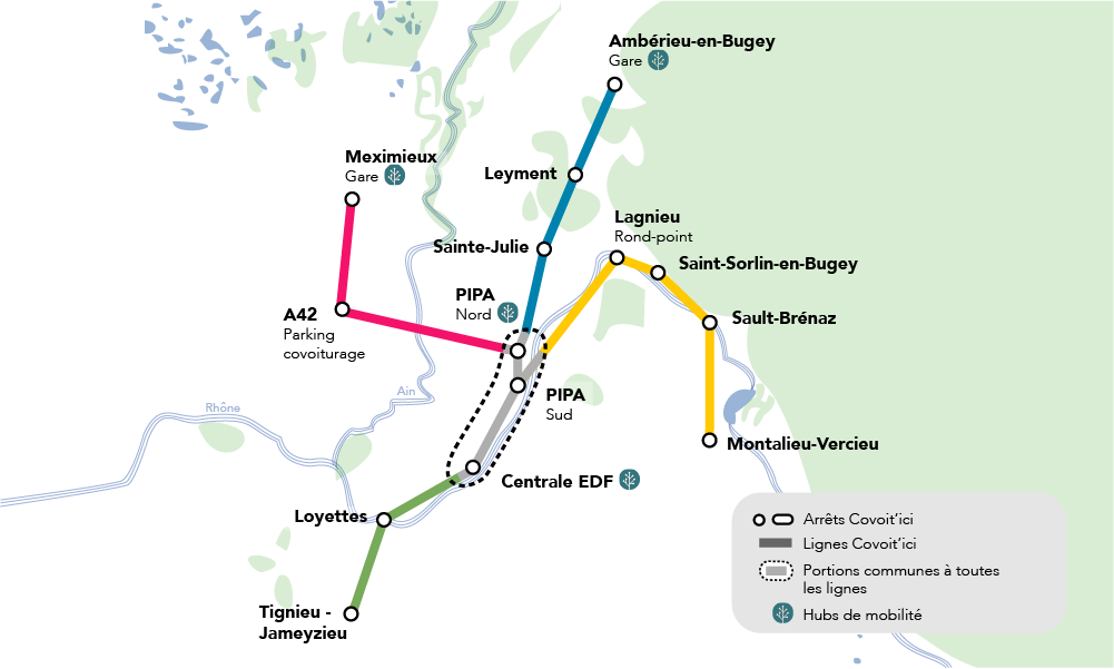 Réseau de covoiturage Covoit’Ici avec notion de tronc commun de lignes, qui maximise l’offre © ECOV et sa plaine de l'Ain