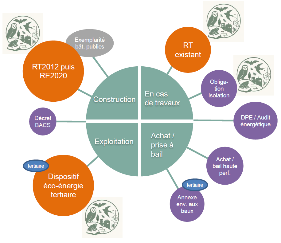 L’objectif est de répondre aux enjeux mis en avant dans la stratégie française énergie-climat : la sobriété, la décarbonatation ou encore l’adaptation au changement climatique. Les 3 réglementations majeures dans le secteur du neuf ou de la réhabilitation (RT2012 puis RE2020, RT existant et dispositif éco-énergie tertiaire) sont décrites, en soulignant l’impact qu’elles pourraient avoir sur les espèces qui utilisent les bâtiments pour réaliser tout ou partie de leur cycle biologique, dont des espèces protégées (oiseaux, chauves-souris, etc.).