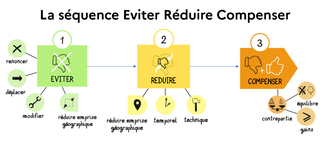 L’évitement et la réduction doivent rester les priorités absolues, la compensation n’intervenant qu’en dernier recours. Et lorsque des mesures compensatoires sont mises en œuvre, il est indispensable de les suivre dans le temps, car sans suivi, impossible de savoir si elles sont réellement efficaces. La mise en œuvre de la séquence ERC s’appuie nécessairement sur un diagnostic, en amont des projets, pour éviter de passer à côté d’enjeux majeurs. L’accompagnement des maîtres d’ouvrage est quasi systématiquement nécessaire, pour les aider à comprendre, à décider et à agir dans le respect de la réglementation en vigueur.