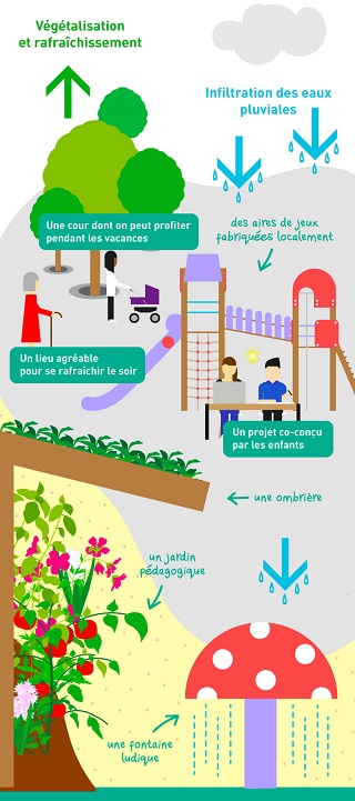 Il s'agit de capitaliser à l'échelon national des démarches de rénovation des cours d'école s'appuyant principalement sur les solutions fondées sur la nature mais aussi qui permettent plus globalement d'améliorer le confort des usagers et des occupants face aux surchauffes d'été (et de printemps). Outre des plantations de végétaux, des revêtements perméables, de l’ombrage, une nouvelle gestion de l'espace, du nouveau mobilier, un point d’eau peuvent être mis en place.