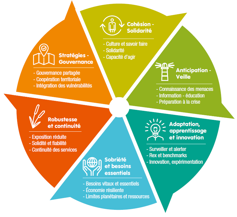Fruit de la synthèse des travaux et retours d'expériences nationaux et internationaux sur le sujet, la Boussole de la résilience défini 6 leviers pour renforcer la résilience du territoire. Au-delà des leviers "classiques" que partage l'adaptation des territoires avec la gestion des risques, la boussole affirme notamment l’importance de la transformation comme principe clé d’une approche nécessairement globale et transversale.