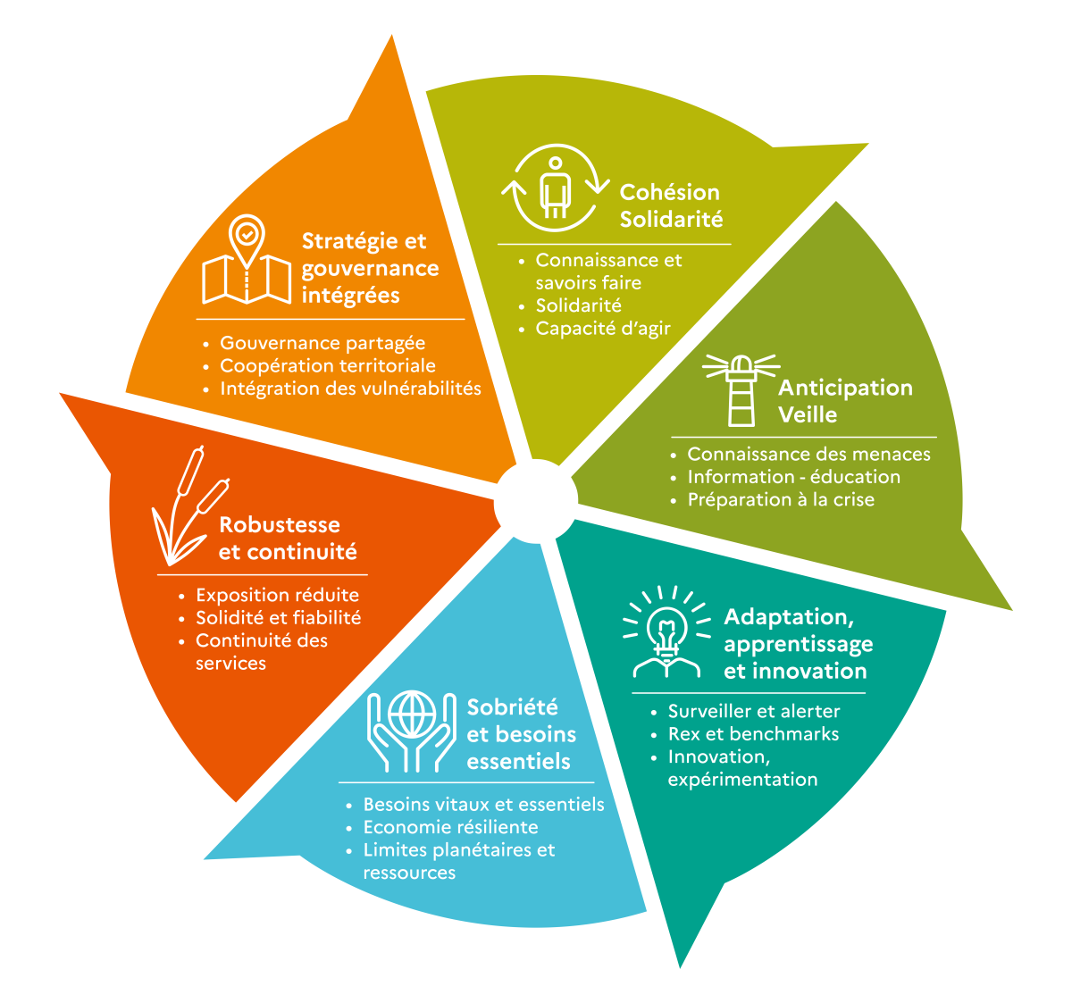 Depuis 2020, le Cerema développe une méthodologie pour accompagner les réflexions autour de la résilience, qui s'appuie notamment sur la boussole de la résilience et fournit un cadre d'action destiné à renforcer l'adaptation des territoires aux différents événements qui peuvent survenir.