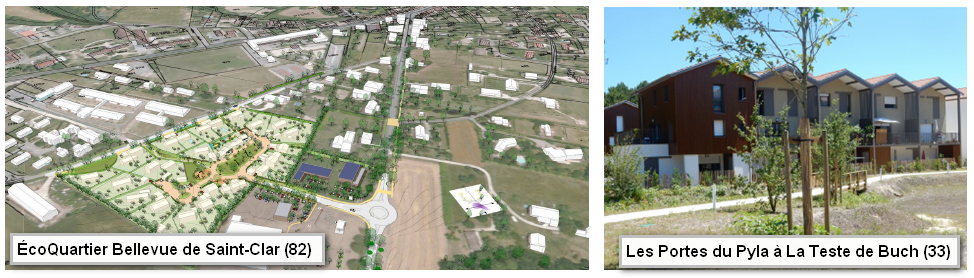 Importance du choix des végétaux à l’ÉcoQuartier Bellevue de Saint-Clar (82) et aux Portes du Pyla de La Teste de Buch (33) : plantations d’espèces locales, robustes, peu gourmandes en d’eau, et diversité des espèces plantées.