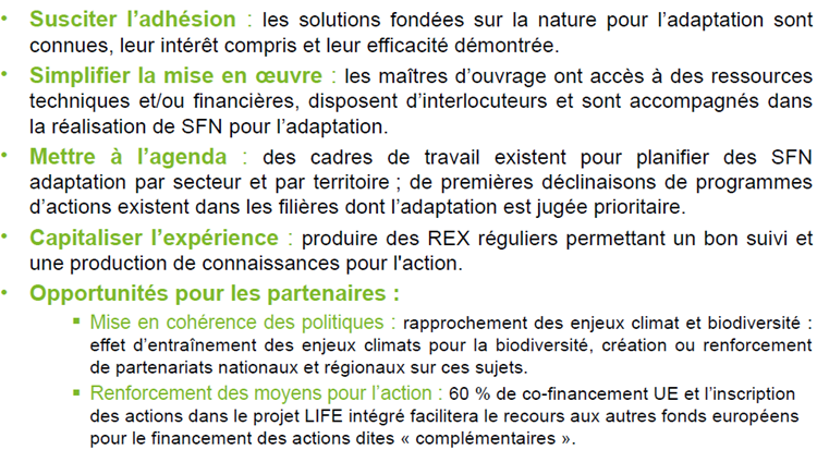L’objectif est de susciter et de multiplier des solutions fondées sur la nature pour favoriser l’adaptation au changement climatique. L’ambition globale consiste à identifier et lever les freins qui entravent aujourd’hui la mise en œuvre de ces actions dans les territoires.