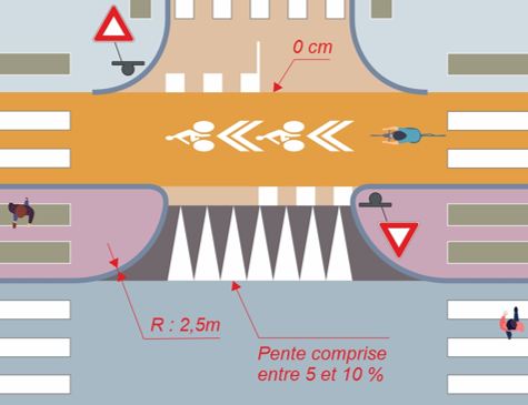 Cette solution garantit de la même manière au cycliste la priorité et une vraie continuité de la piste cyclable sans rupture de niveau et sans qu’il y ait besoin de signalisation particulière. Comme pour le trottoir, la hauteur de la piste adjacente est maintenue dans le franchissement de la voie non prioritaire. Les conducteurs qui s’engagent dans la voie principale depuis la voie secondaire doivent céder le passage aux piétons et aux conducteurs et cyclistes circulant sur la voie principale (art 415-9 du code de la route). Aucune signalisation n’est nécessaire.