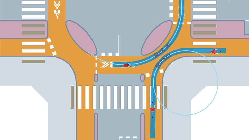 La règle d’or pour tous les projets de carrefour est la crédibilité des trajectoires cyclistes. Elle ne peut être obtenue qu’en concevant des infrastructures respectant les règles sur les rayons de courbures.