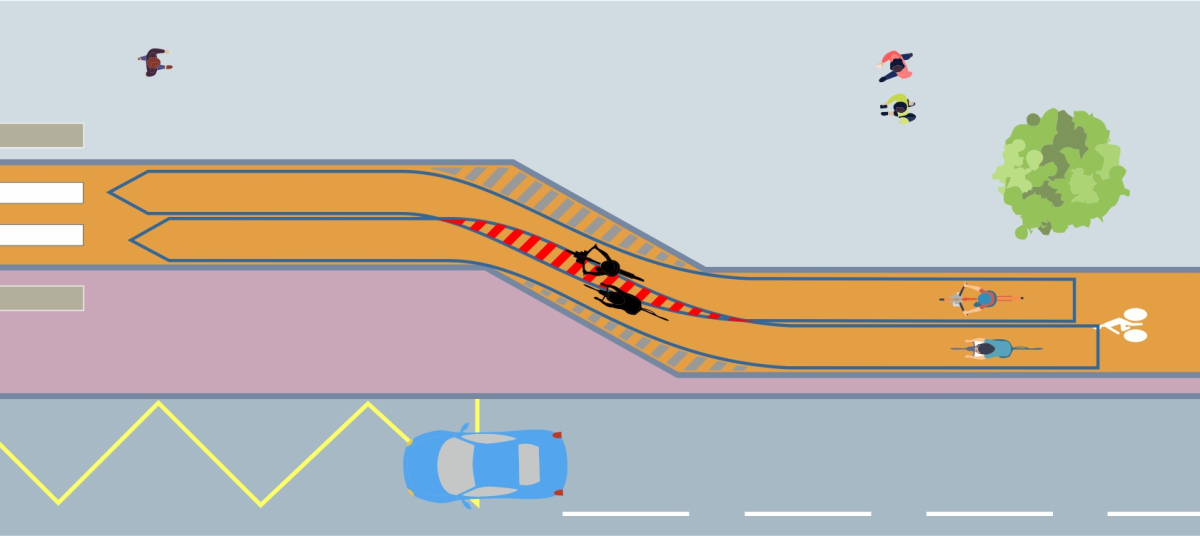 Zoom sur le franchissement au niveau de chaussée avec un dévoiement de la piste cyclable