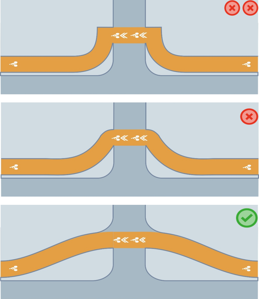 Il est rarement possible d’appliquer toutes les règles précitées de manière stricte, car certaines peuvent être contradictoires. Par exemple, lors d’un changement de côté d’une piste bidirectionnelle (voir schéma ci-dessous), les exigences en matière d’orthogonalité peuvent aller à l’encontre de celles liées à l’efficacité et au confort. Il faut alors trouver un compromis équilibré entre ces différentes contraintes.