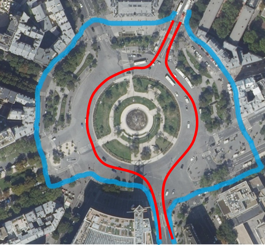 l’anneau cyclable est éloigné de l’anneau motorisé d’une distance de 5 m, ce qui permet la création d’îlots qui permettent le stockage d’un véhicule en cas de passage d’un cycliste . Ils favorisent également un apaisement des vitesses des trafics motorisés et une orthogonalité des trajectoires,