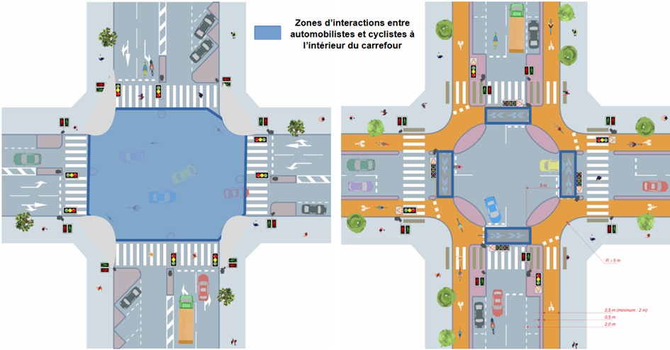Ces carrefours visent à réduire le problème de l’angle mort pour une traversée cyclable en conflit avec des mouvements tournants dans la même phase de feu.