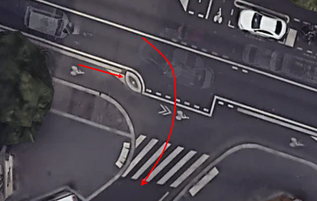 Enfin, cette orientation peut faire croire à l’automobiliste que le cycliste quitte son aménagement pour tourner dans la rue perpendiculaire, ce qui risque de le surprendre lorsque le cycliste traverse en réalité la voie dans laquelle la voiture s’engage.
