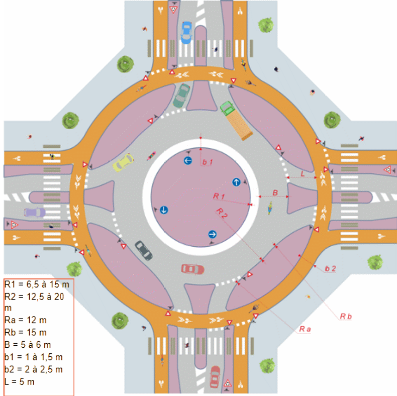 les rayons de girations sont de 12 m en entrée de giratoire (ra) et de 15 mètres en sortie (rb).