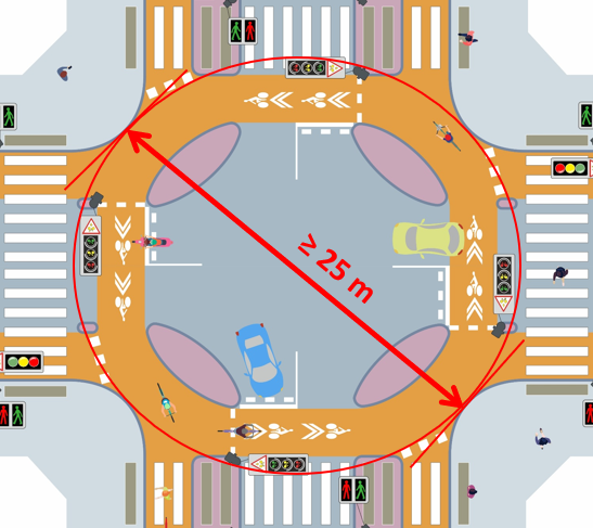 Les traversées cyclables sont autant que possible parallèles aux traversées des voitures (continuant « tout droit » dans le carrefour) et sont éloignées de celles-ci d’une distance minimale de 5 m, dans le respect des rayons de courbure des trajectoires directes vélos (10 à 20 m de rayon),